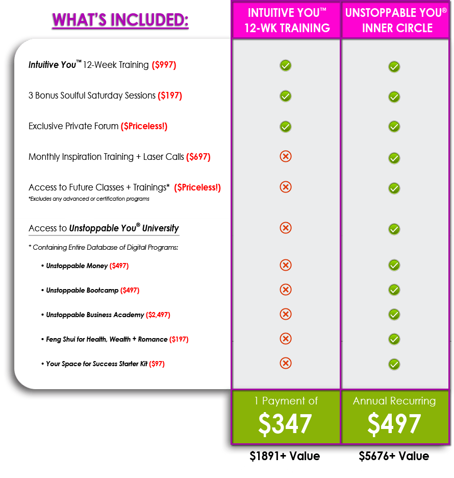For only $150 more(that’s only $12.50/month extra!) you receive this Intuitive You™ Training, Monthly Live Training Calls, access to the ENTIRE Unstoppable You University Digital Library… and more!!! (a $5676+ value)
